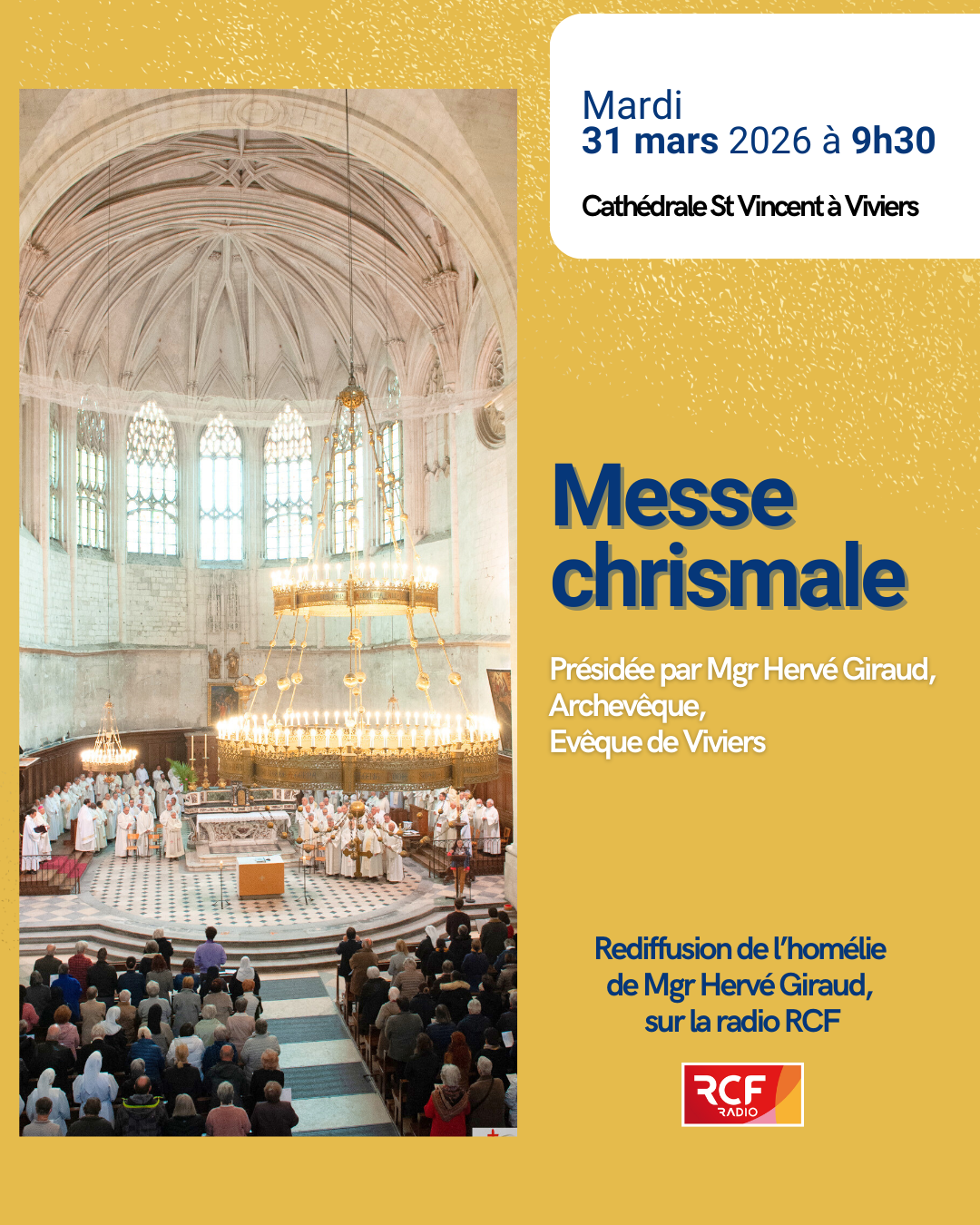 Messe chrismale 2026 Le mardi 31 mars à 9h30, la cathédrale de Viviers accueillera la messe chrismale, présidée par Mgr Hervé Giraud, en présence de tous les prêtres du diocèse. [...]