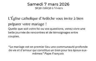 Préparez votre mariage avec l’Église catholique d’Ardèche !Le samedi 7 mars 2026, de 9h30 à 16h30, la Maison diocésaine Charles de Foucauld à Viviers accueillera une journée dédiée [...]