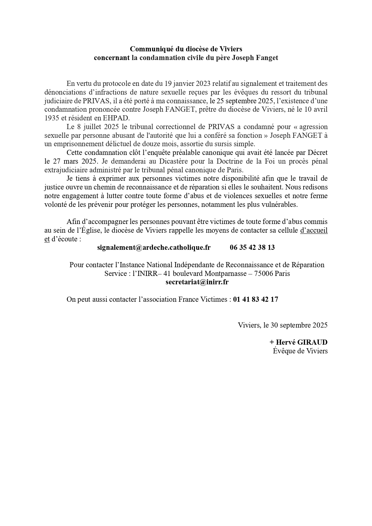 Communiqué du diocèse de Viviers concernant la condamnation civile du P. Joseph Fanget Partager :Cliquez pour partager sur Facebook(ouvre dans une nouvelle fenêtre)Cliquer pour imprimer(ouvre dans une nouvelle fenêtre) Cécilia Grand2025-09-30T18:02:56+02:00 Partagez cet article sur votre réseau ! FacebookTwitterLinkedInWhatsAppPinterestEmail