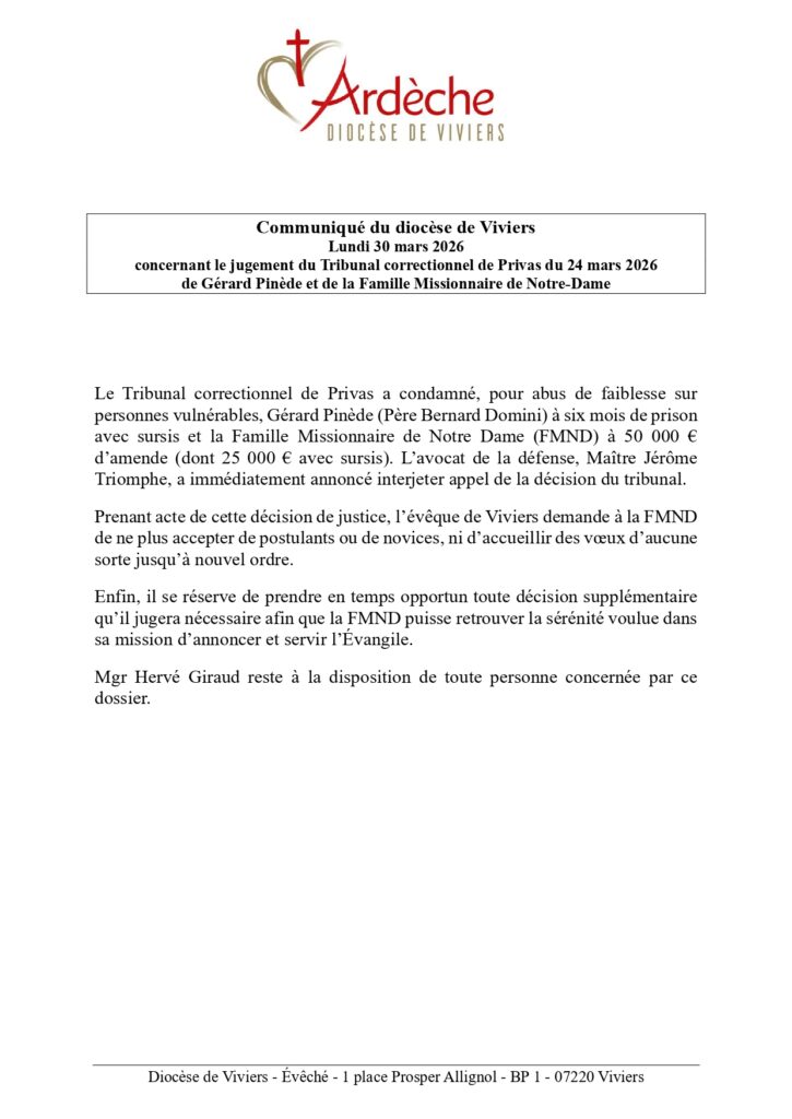 Communiqué du diocèse de Viviers concernant la FMND Télécharger le document en PDF Communiqué du diocèse de Viviers suite à la décision du tribunal de Privas : Mgr Hervé Giraud prend acte du jugement et annonce des mesures concernant la Famille Missionnaire de Notre-Dame. Partager :Cliquez pour partager sur Facebook(ouvre dans une nouvelle fenêtre)Cliquer pour imprimer(ouvre dans une nouvelle fenêtre) Cécilia Grand2026-03-30T13:45:02+02:00 Partagez cet article sur votre réseau ! FacebookTwitterLinkedInWhatsAppPinterestEmail
