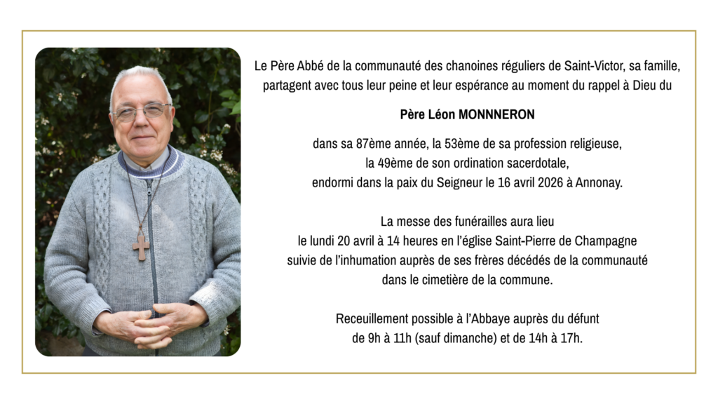 Décès du Père Léon Monneron, de la communauté des chanoines réguliers de Saint-Victor Partager :Cliquez pour partager sur Facebook(ouvre dans une nouvelle fenêtre)Cliquer pour imprimer(ouvre dans une nouvelle fenêtre) Cécilia Grand2026-04-17T15:49:51+02:00 Partagez cet article sur votre réseau ! FacebookTwitterLinkedInWhatsAppPinterestEmail