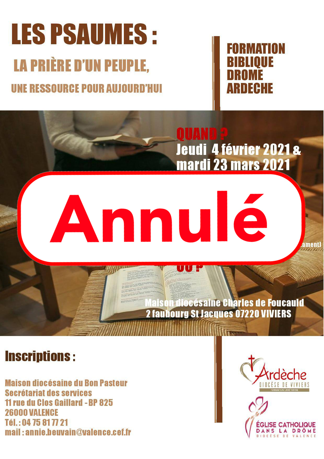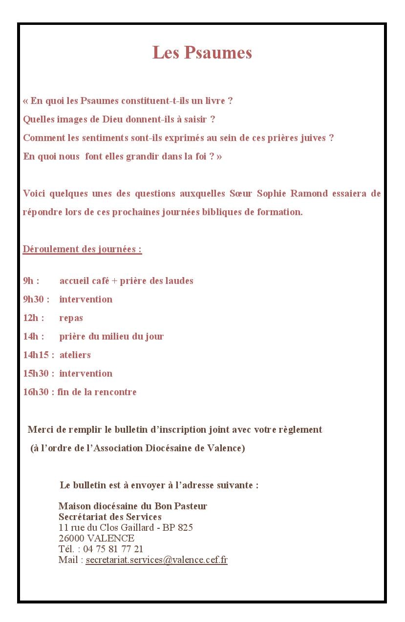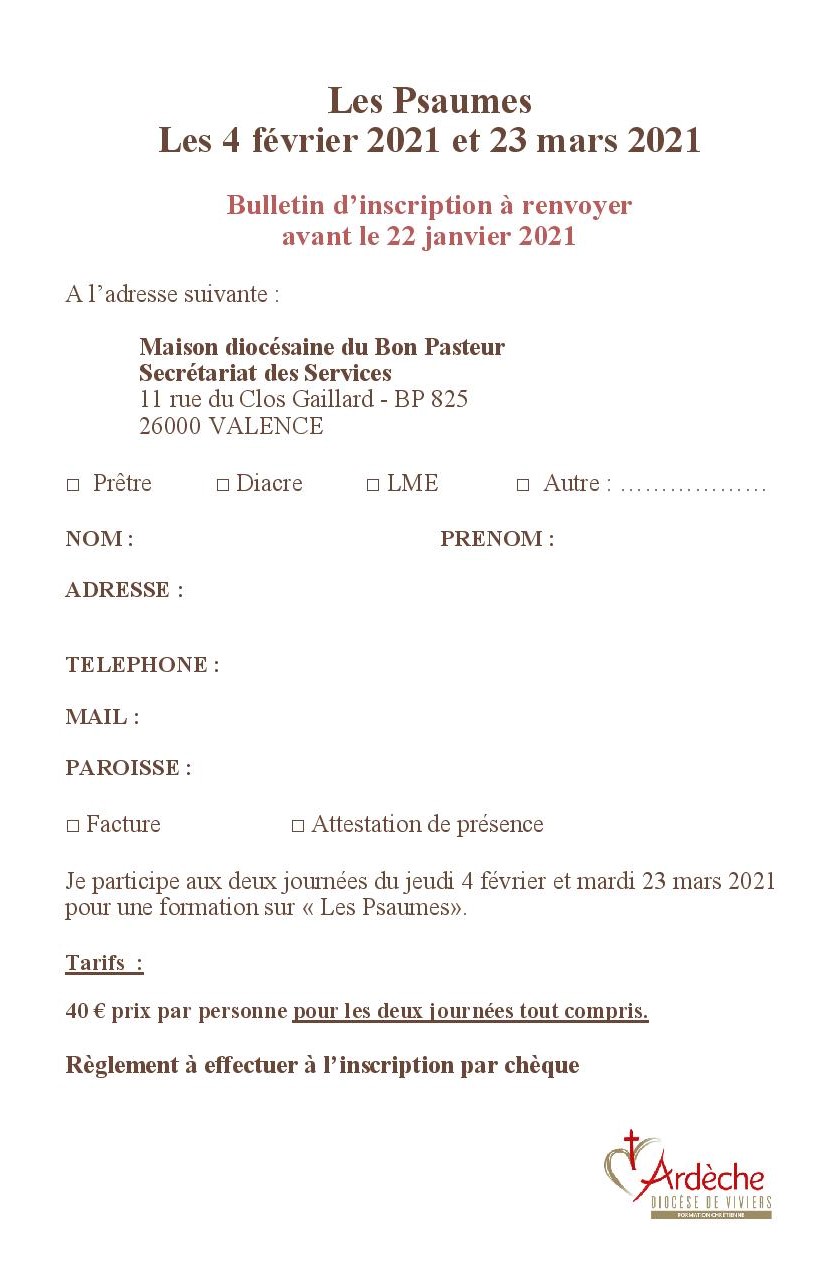 Le jeudi 4 février et le mardi 23 mars, de 9h à 16h30, formation biblique sur le thème « Les psaumes : La prière d’un peuple, une ressource pour aujourd’hui ».