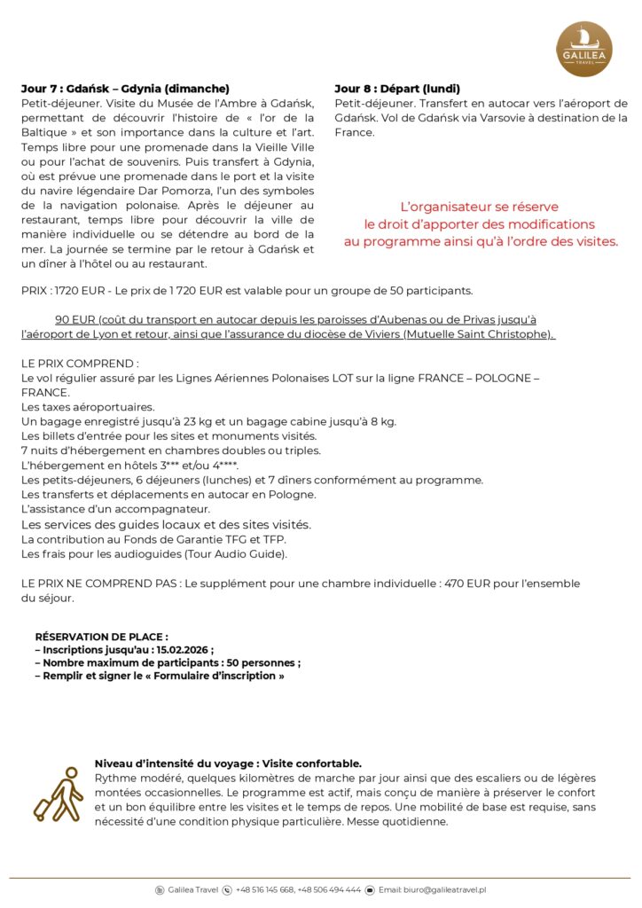 Du 19 au 26 octobre 2026, le diocèse propose un pèlerinage en Pologne sur le thème : « Sur les traces de la foi et de l’histoire de la Pologne », en partenariat avec Galilea Travel.